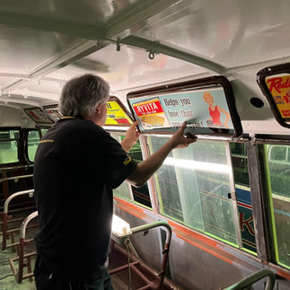 In the last few weeks the top deck ceiling has been repainted and refurbished advertising racks have been refitted. The light fittings have been polished and reinstalled, together with a complete replacement of all window rubbers and felt throughout. Freshly painted masonite panels for the inner side walls and metal trim are presently being installed.